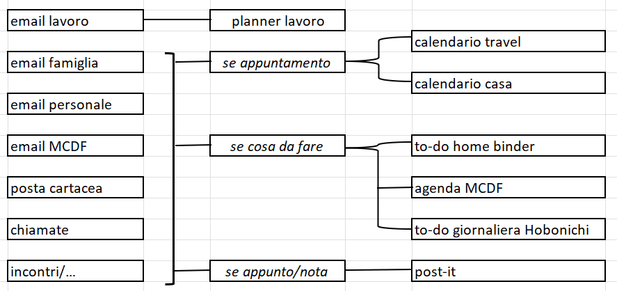 Cominciate elencando tutte le fonti di informazioni che avete: vari indirizzi mail, chiamate, incontri, gruppi WhatsApp, etc. E poi capite dove vanno a finire le informazioni, e che criteri adottate (spesso inconsciamente, per abitudine).